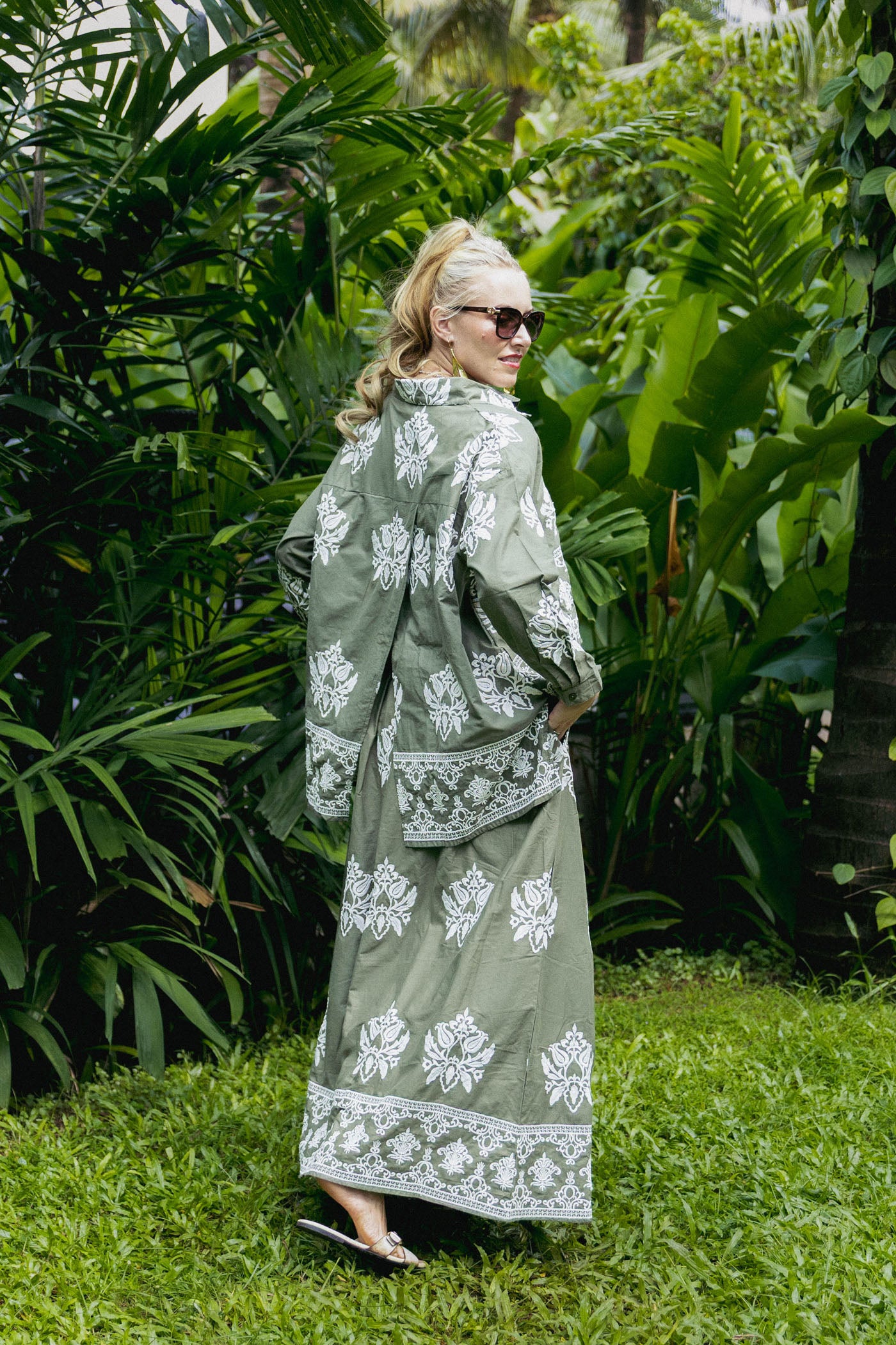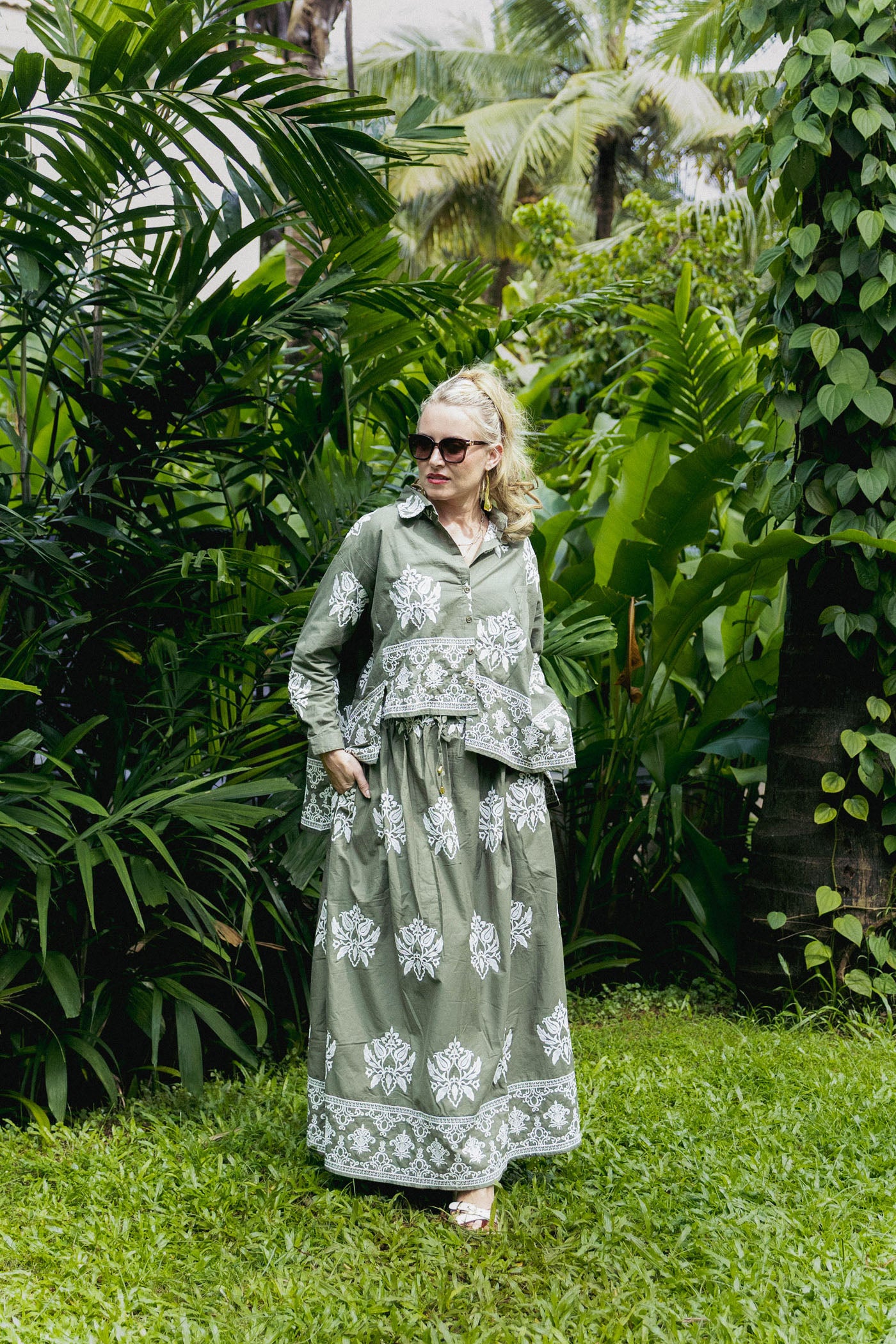 Computerise embroidery GREEN APPLE dramatic top shirt with full length embroidery skirt