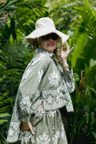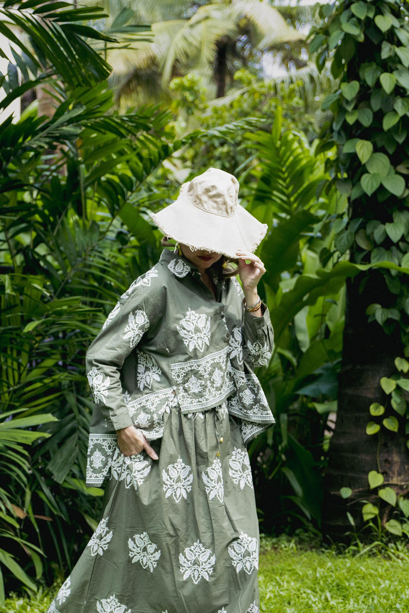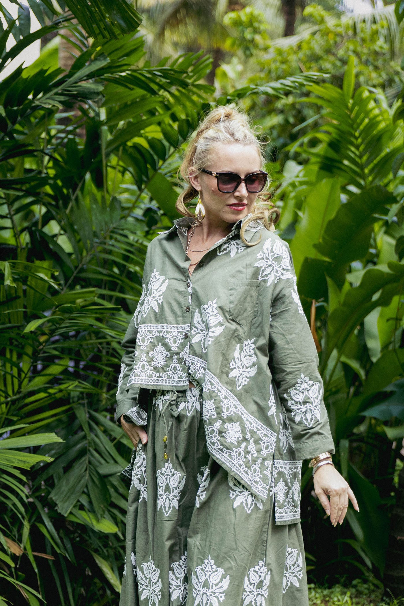 Computerise embroidery GREEN APPLE dramatic top shirt with full length embroidery skirt