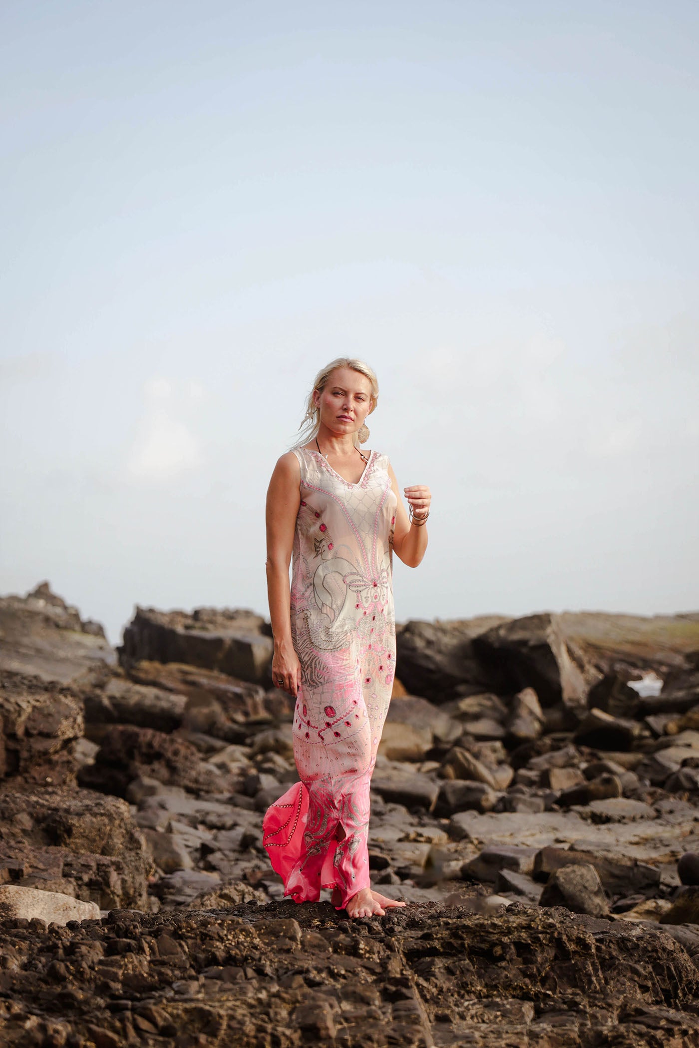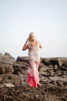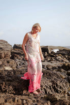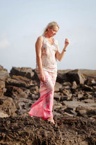 Dress is pure fire – bold. It starts with a soft silver base up top, then explodes into a fierce hot-pink ombre at the bottom. Swirling paisley motifs in grey and pink dance across the fabric, giving it that artistic. Made from feather-light viscose georgette that flows and twirls with every step, this sleeveless maxi feels like wearing nothing while looking like everything. Relaxed fit, ankle-skimming length, and designed to slay on everybody.