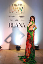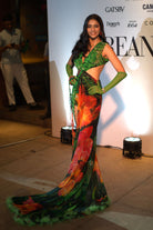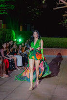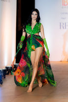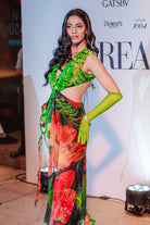 Vibrant green tropical-print dress with plunging cut-out midriff, high-waisted silhouette, and dramatic floor-length viscose georgette trail in bold floral bursts.