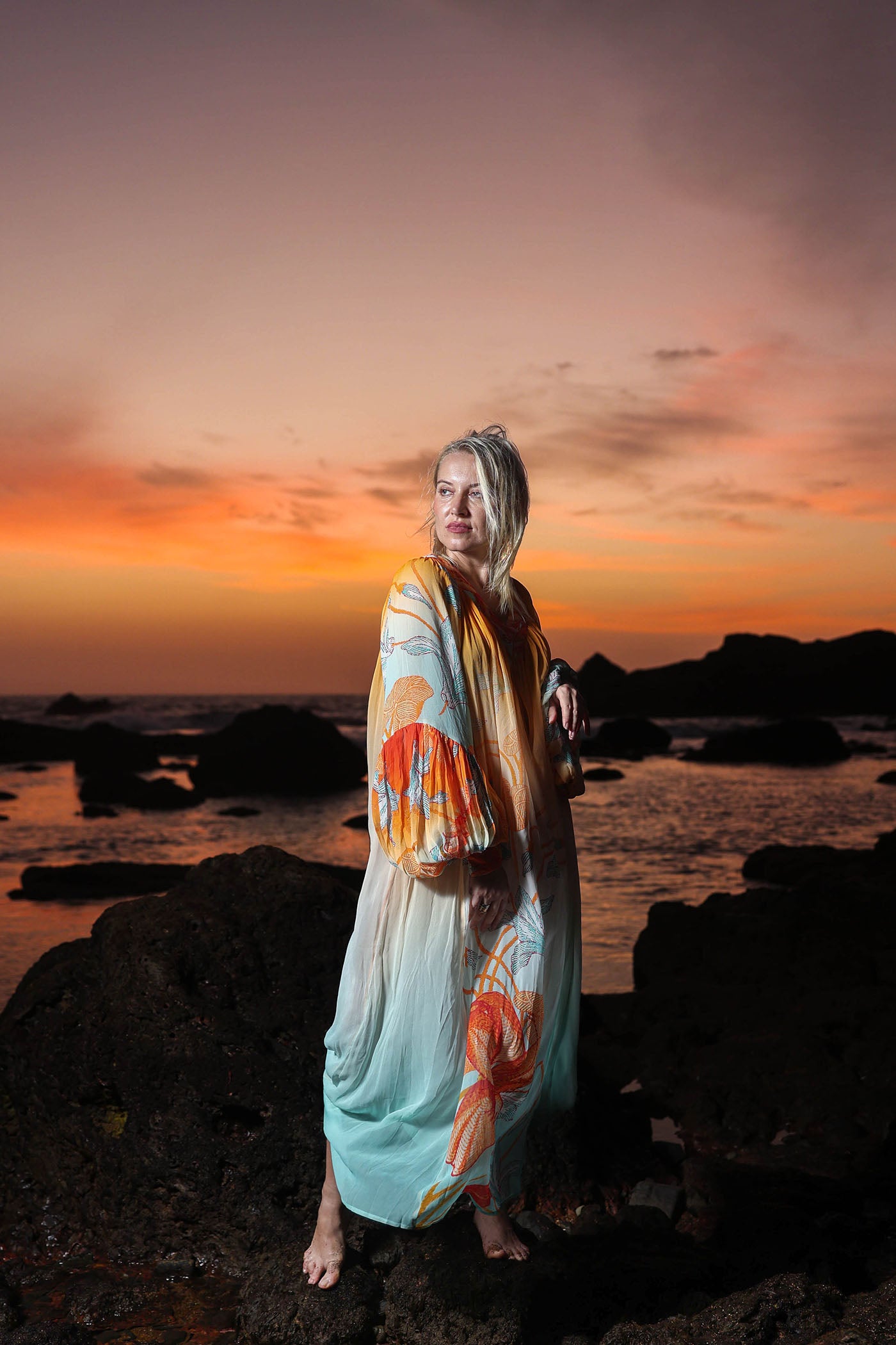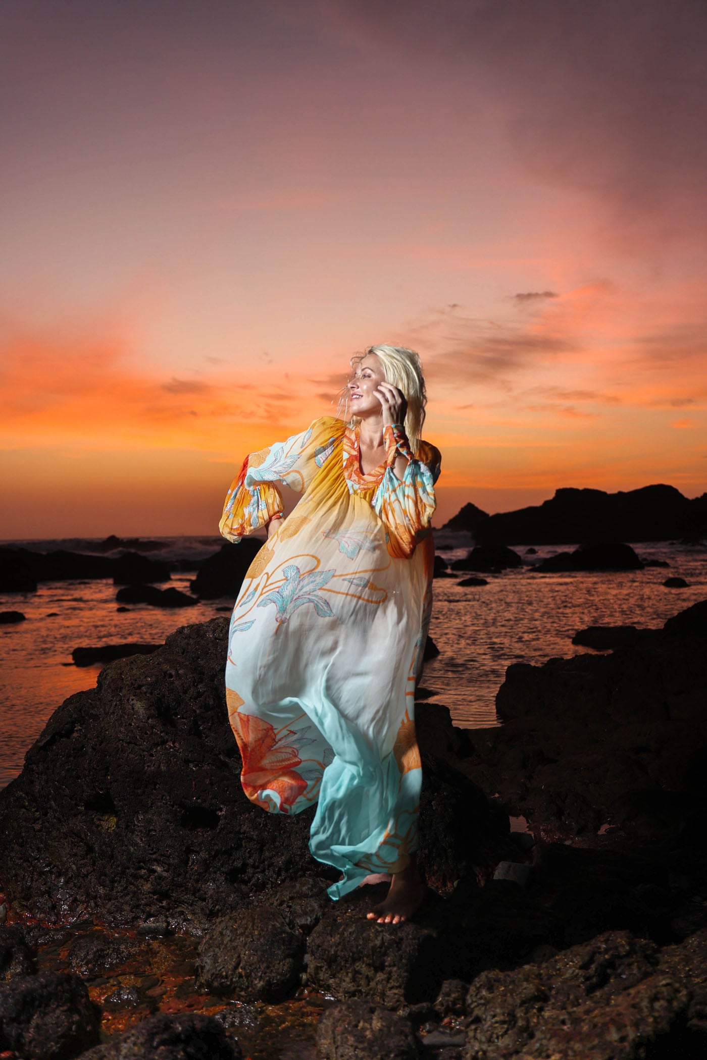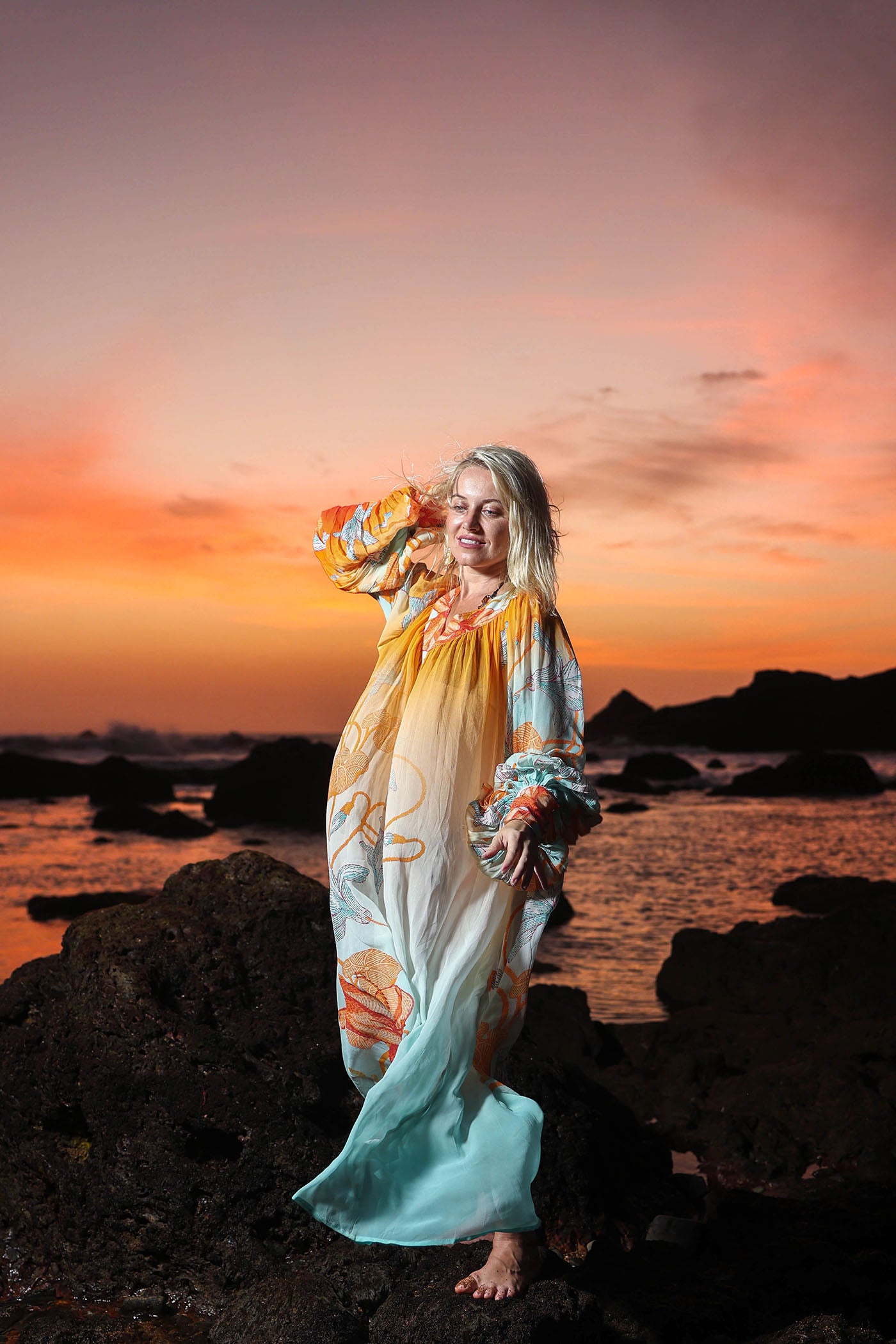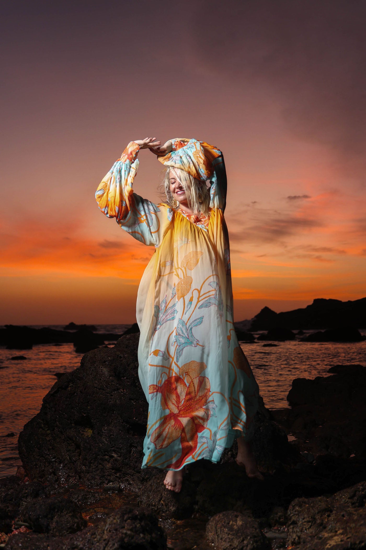 Own the golden hour in this ethereal long dress, A dreamy ombre shifts from orange at the shoulders to soft blue at the hem, overlaid with oversized floral blooms in coral, orange, and mint. The dramatic bell sleeves flare with ruffled cuffs while the square neckline gathered empire waist creates effortless shape and flow. Crafted from whisper-light viscose georgette, it moves like water, skimming your body in soft layers that catch every breeze.