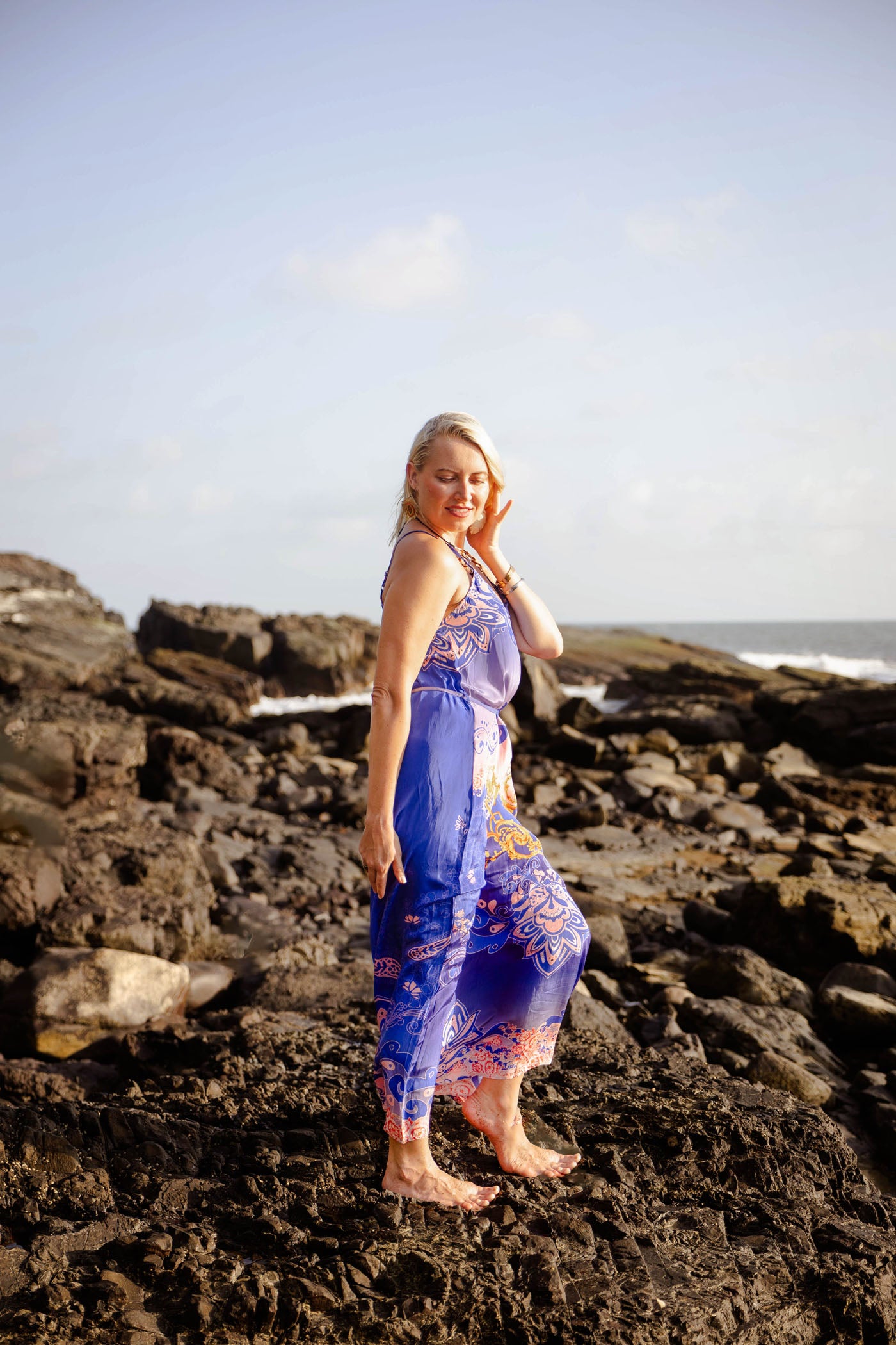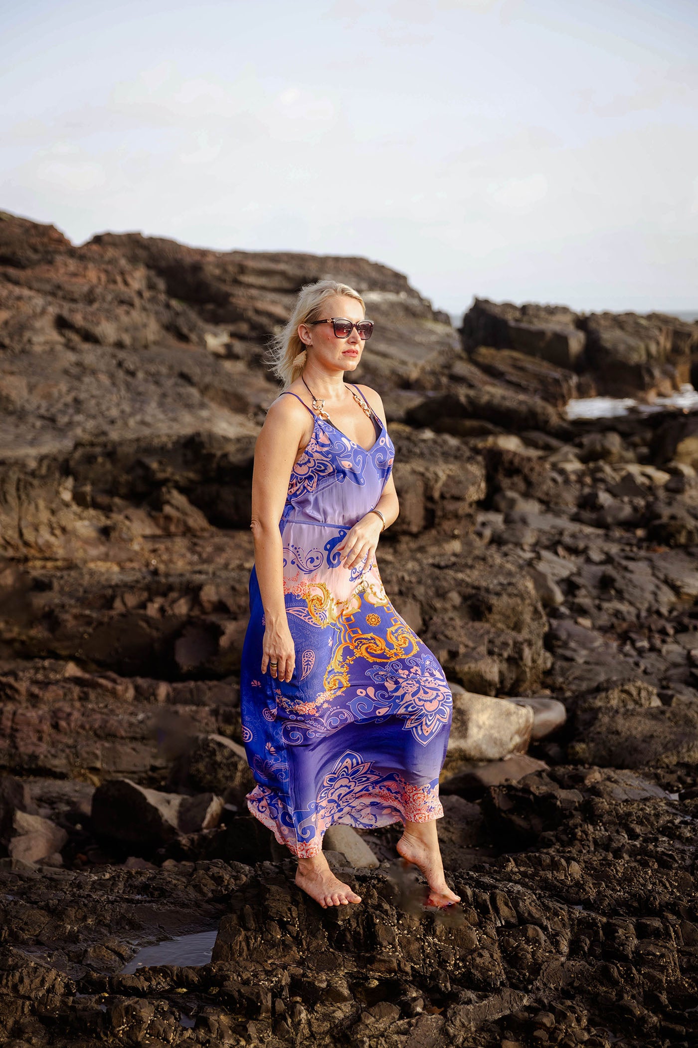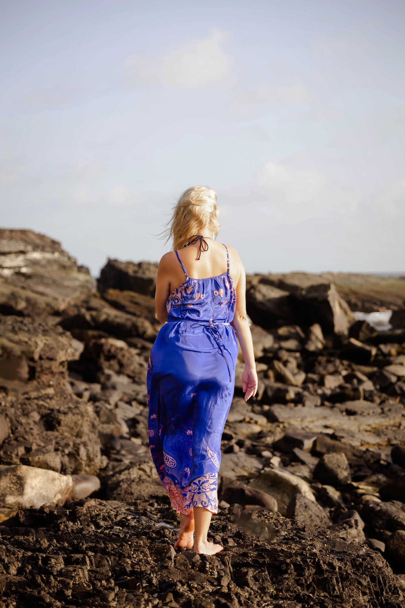 Elevate your summer wardrobe with this cobalt charm long dress, where deep cobalt blend and create a calming and utterly chic. Intricate paisley motifs dance across the fabric in creamy whites and warm corals, with a striking floral border at the hem adding a playful pop of contrast—like waves crashing in vibrant color. The lightweight viscose georgette fabric delivers that luxurious flow you crave, gently gathering at the bust for subtle shape while the slim spaghetti straps and relaxed straight silhouette keep everything effortless and cool.