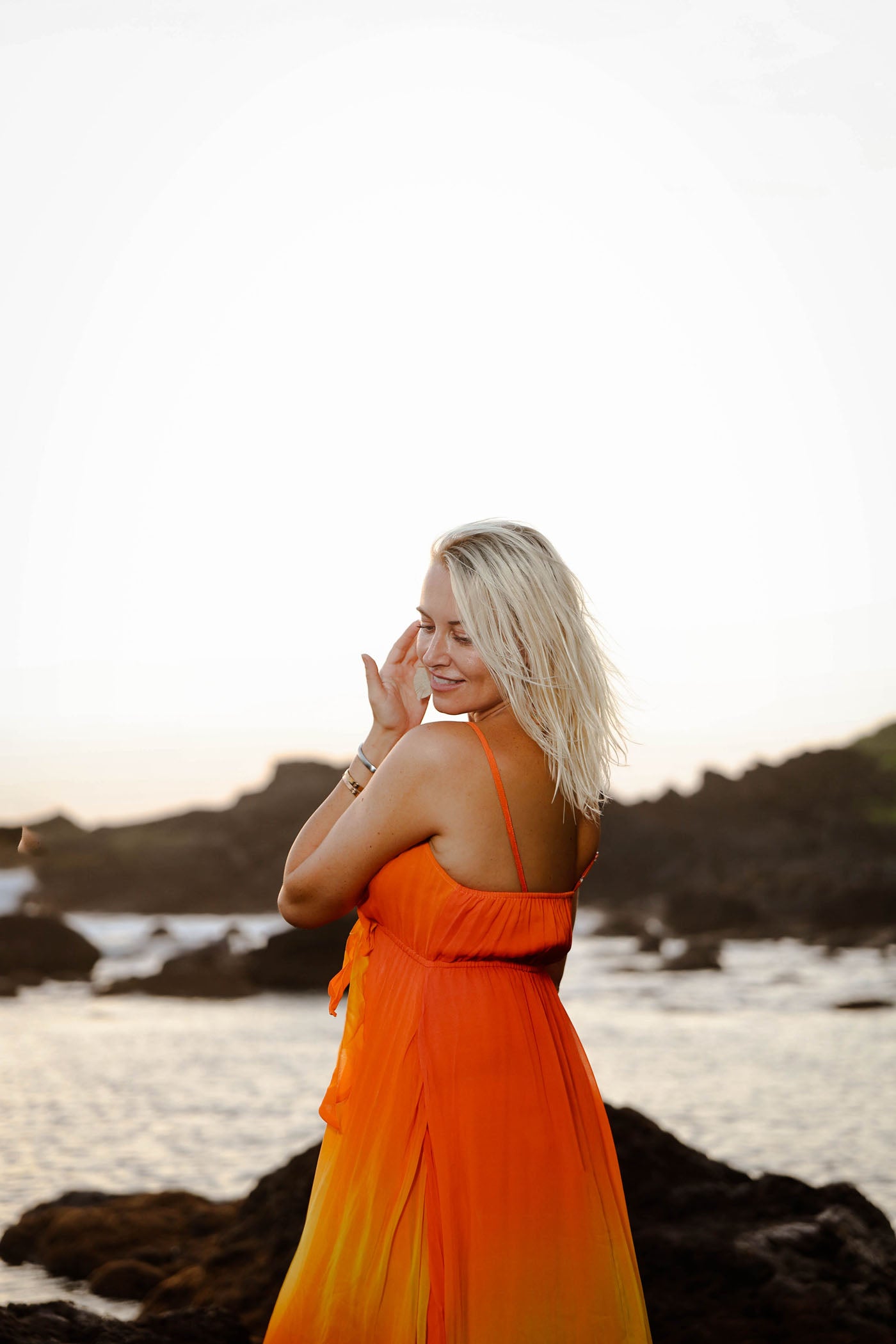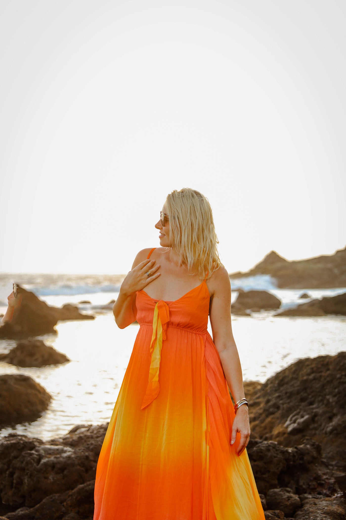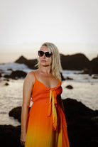 Ignite your summer wardrobe with this fiery ombre long dress that fades from soft peach to blazing orange-yellow—like capturing a beach sunset in fabric. The viscose georgette drapes effortlessly, with a playful tie-front V-neck that lets you cinch or loosen for your vibe. Thin straps and a relaxed empire cut keep it comfy and flattering, while the flowing ankle length adds that perfect swish. Bold color play meets easy wear—your go-to for standing out without effort.