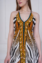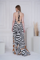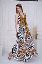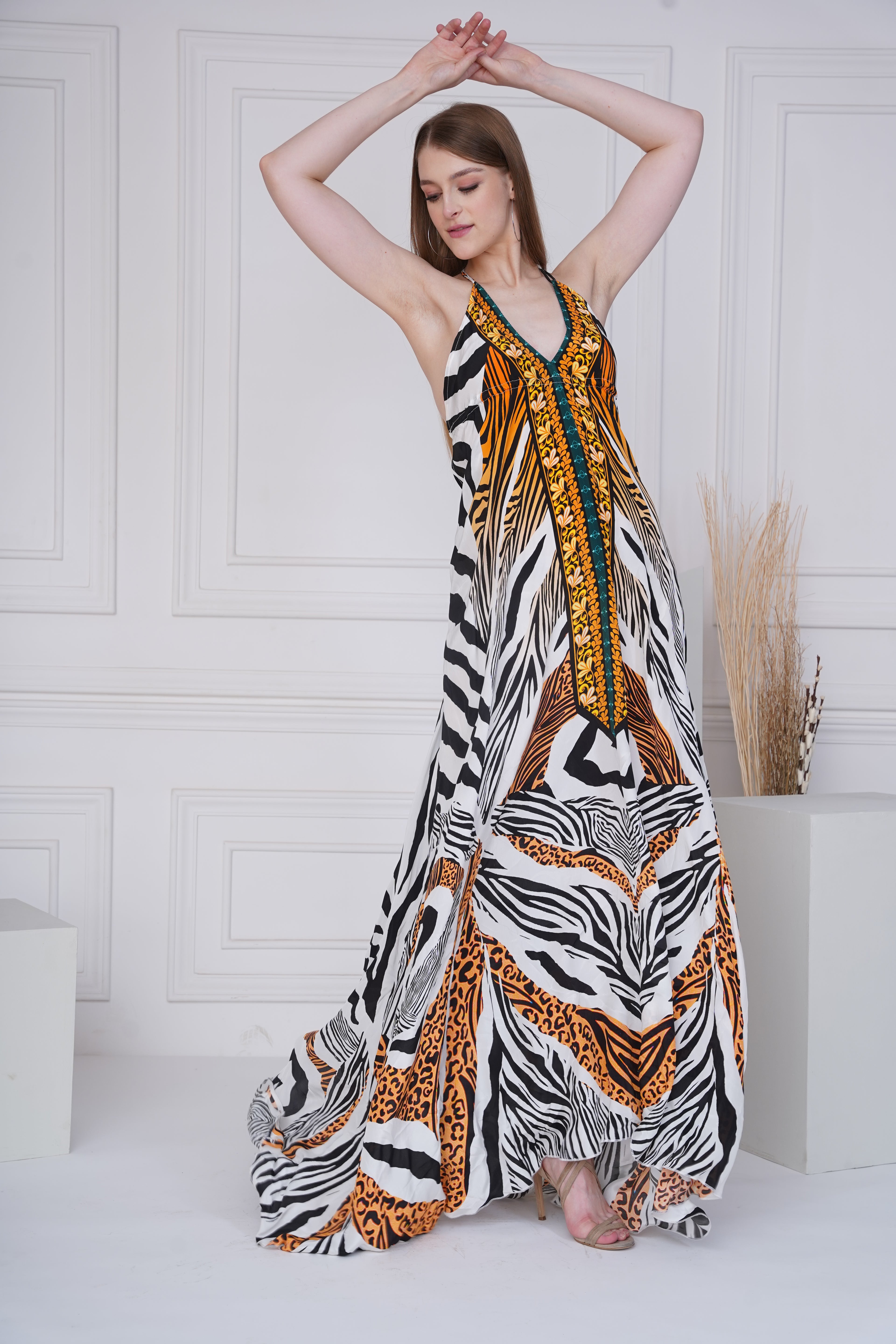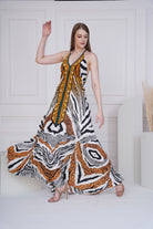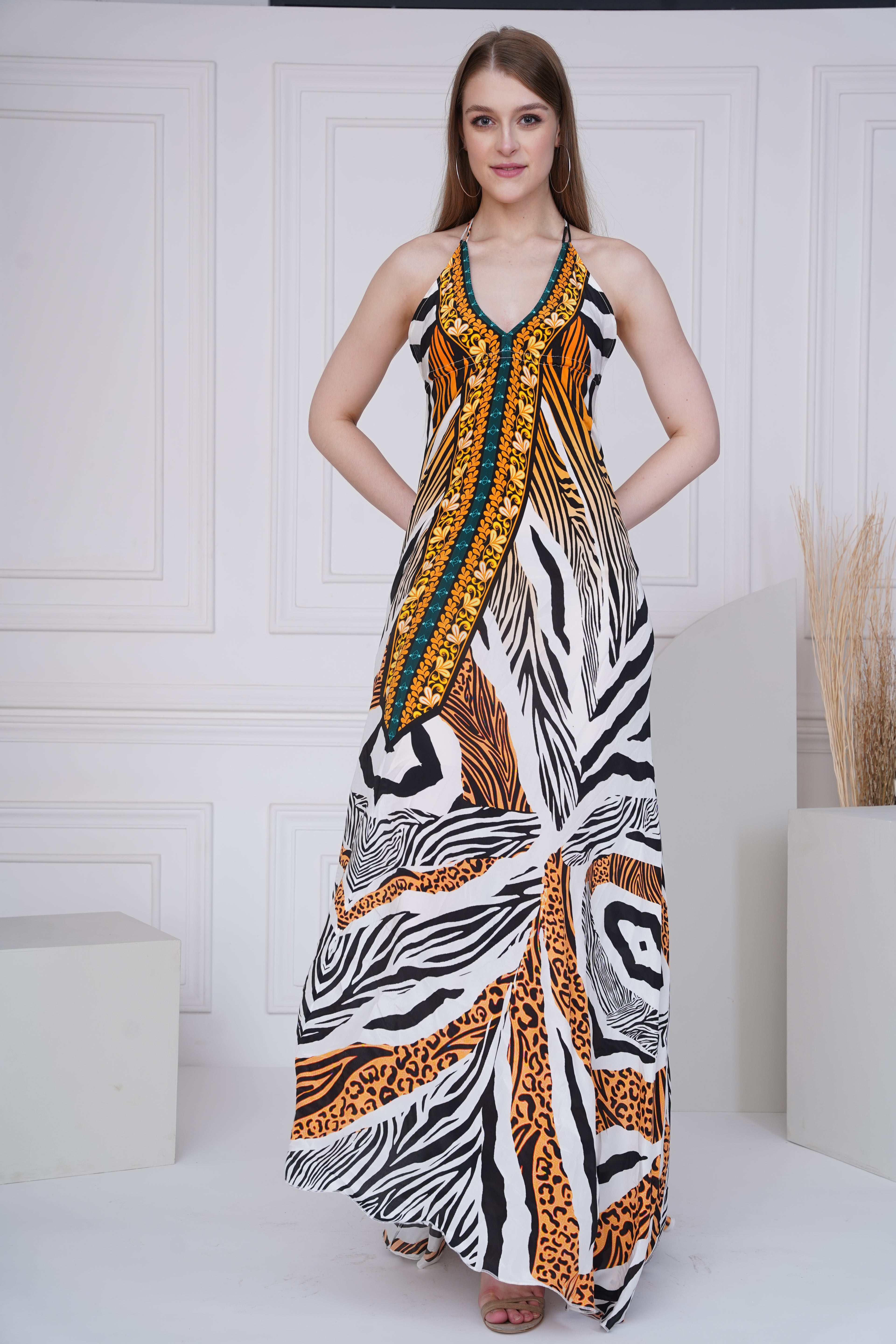 Bold, floor-length long dress in lightweight viscose crepe fabric, featuring a vibrant mixed animal print pattern combining zebra stripes, tiger stripes, and leopard spots in black, white, and orange tones, accented with a colorful floral band across the chest.