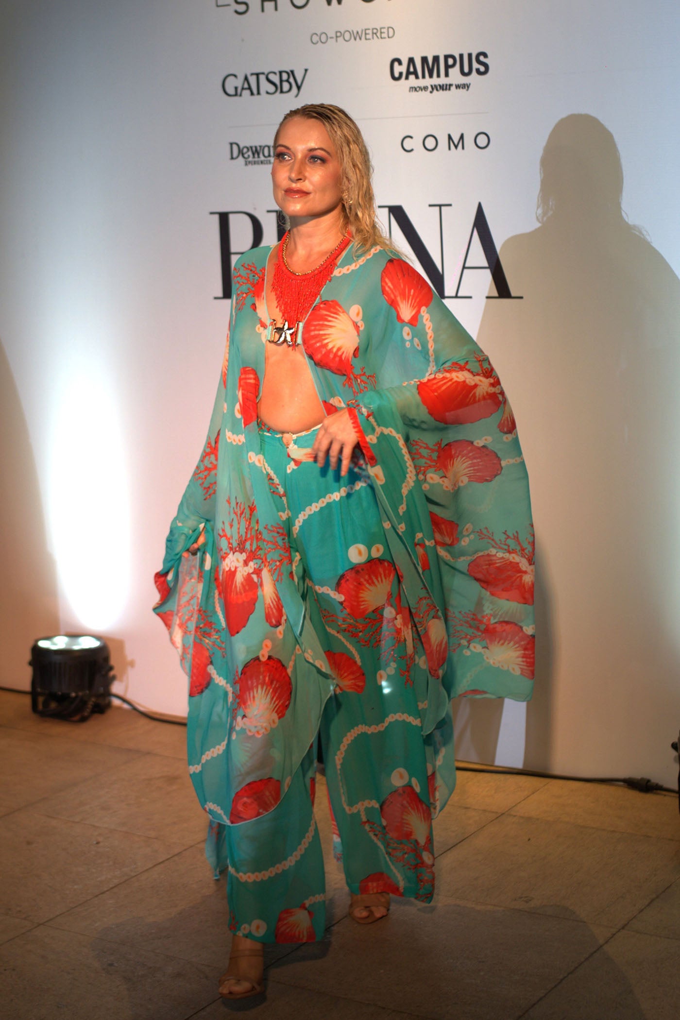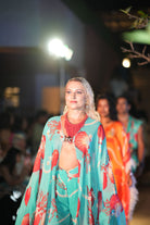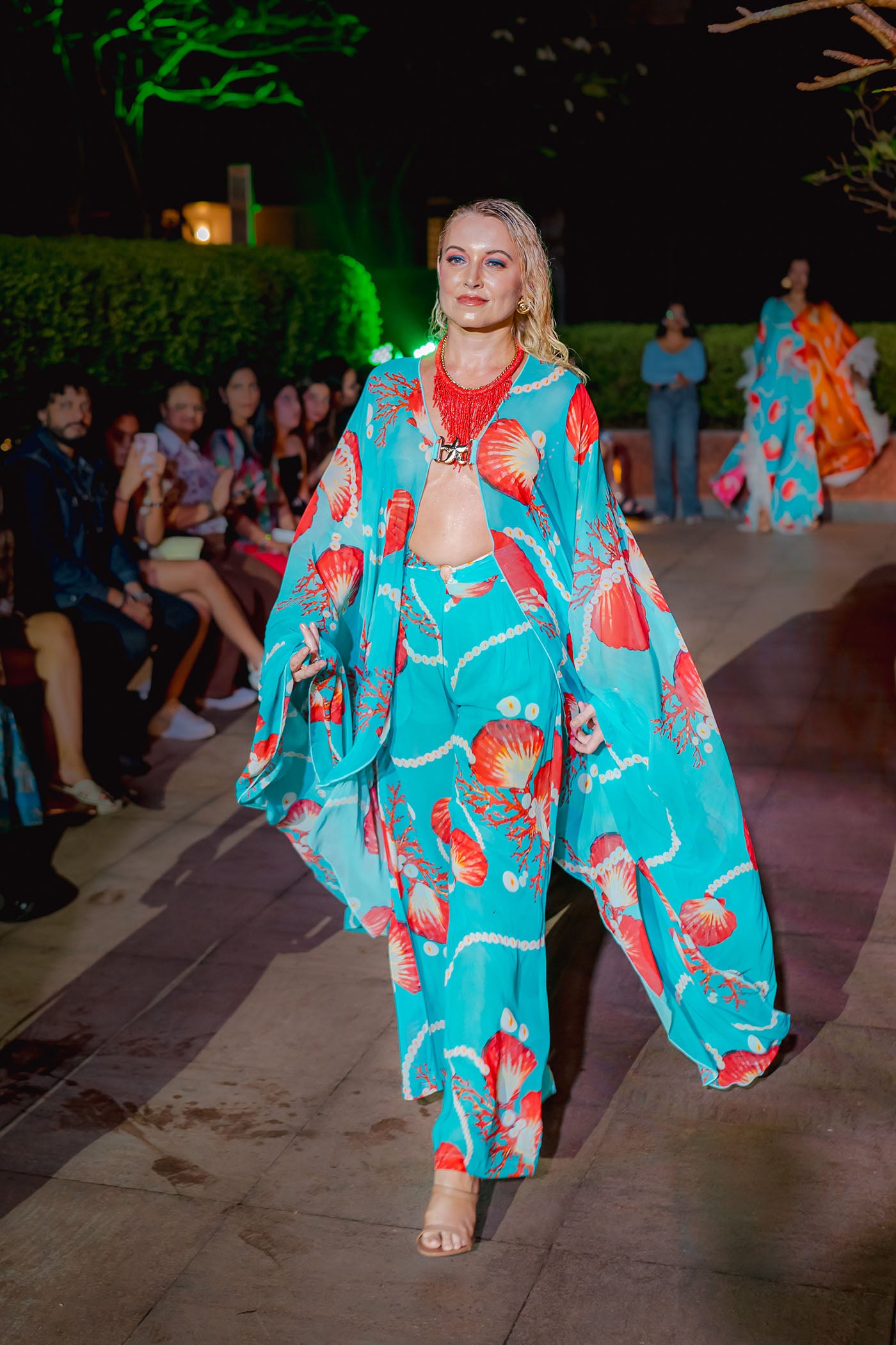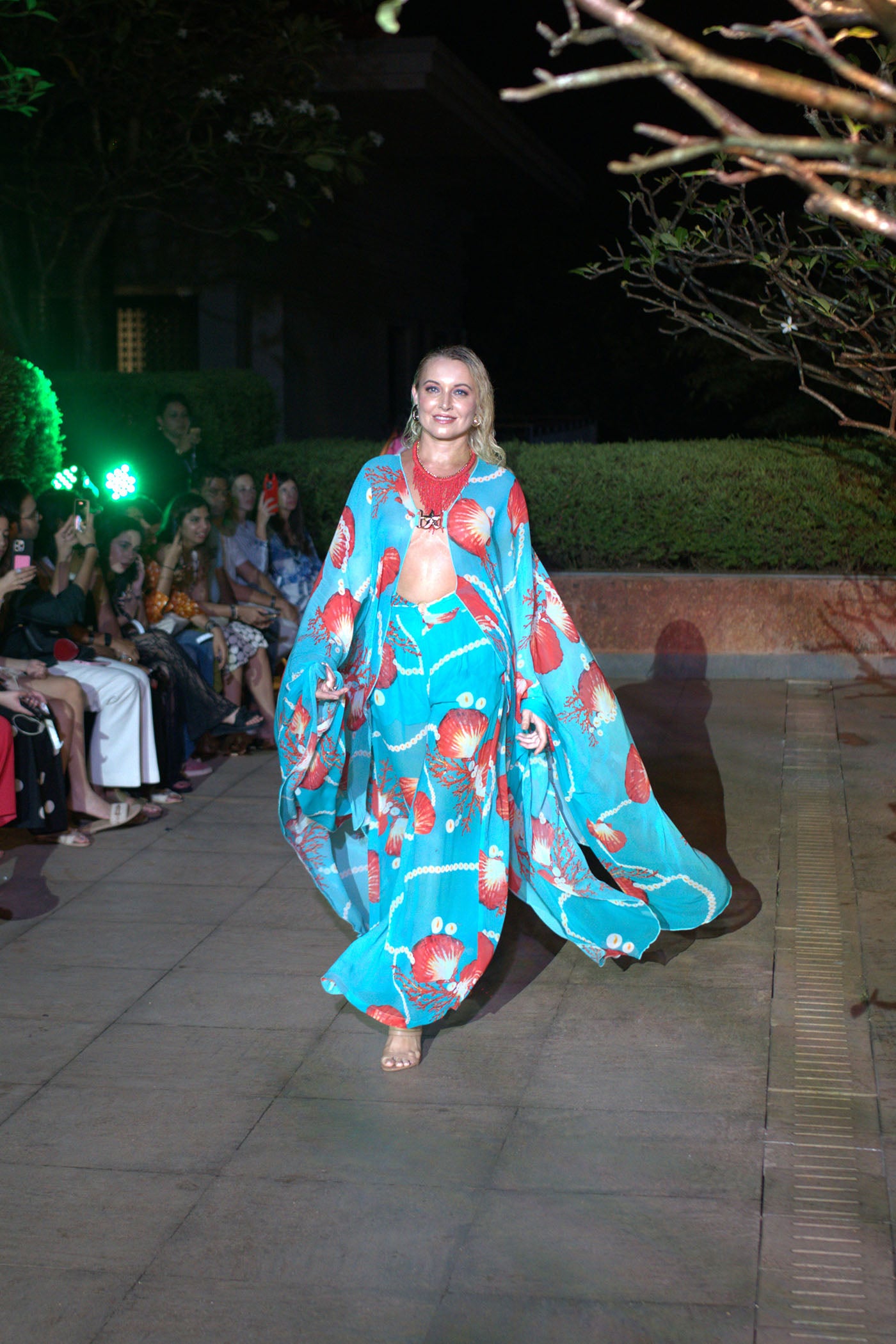 Ethereal sky blue viscose georgette jumpsuit dress with a daring front cut-out, bold red seashell and pearl-chain prints, and extravagant flowing kimono sleeves that cascade like ocean waves—this inclusive, all-sizes resort masterpiece.