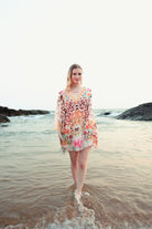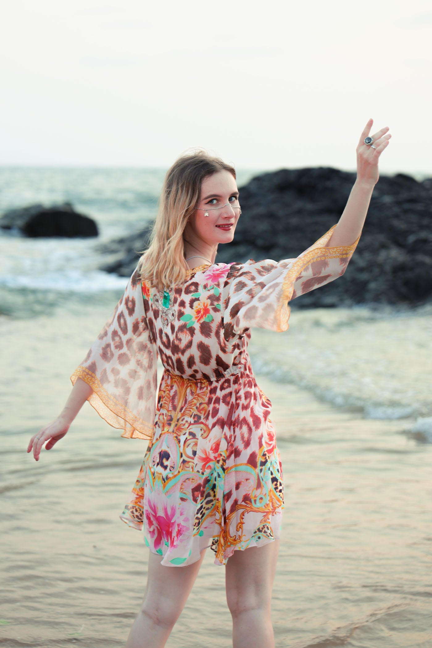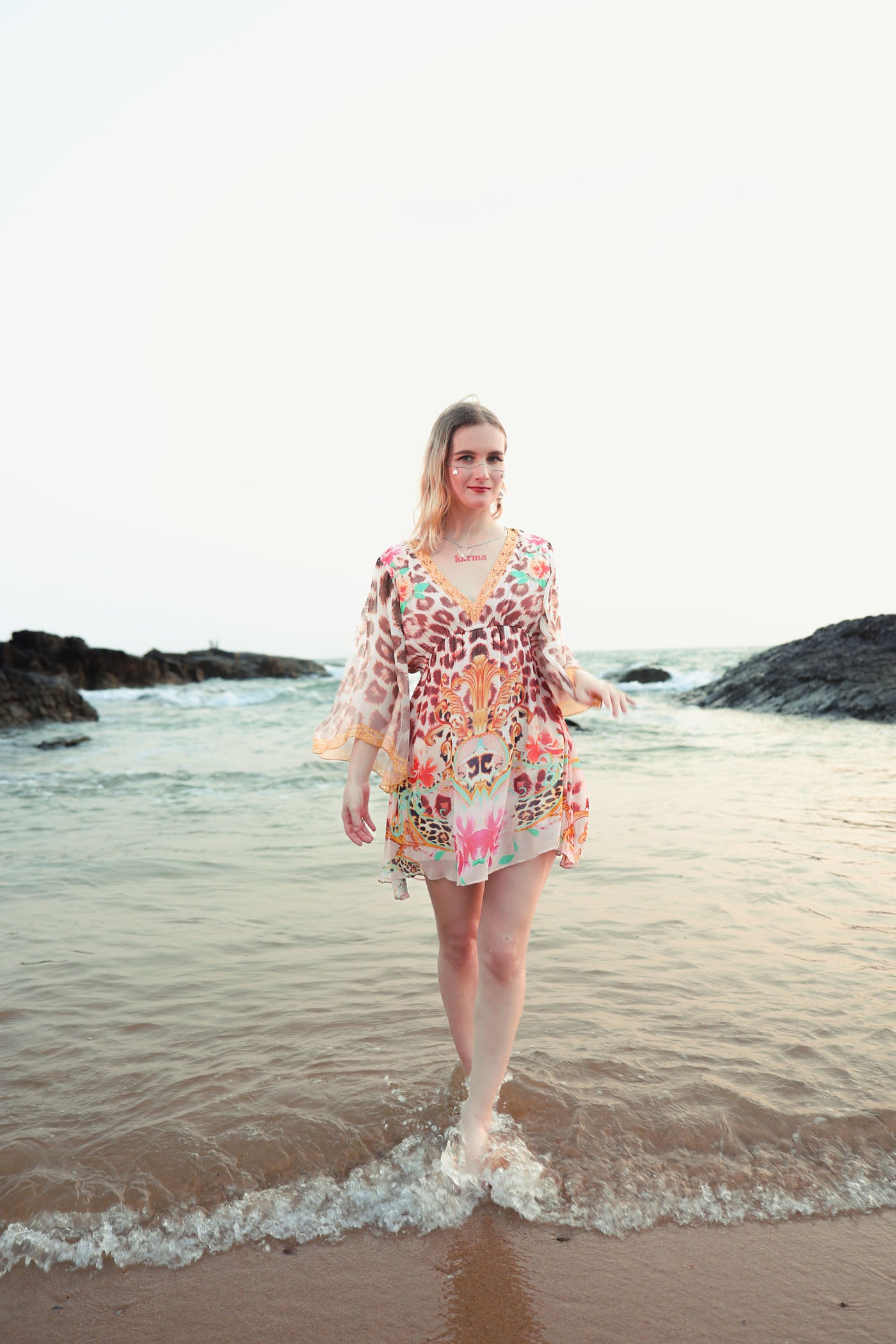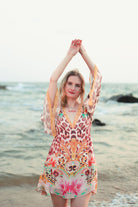 Peach multi mini dress in viscose georgette is a breezy piece that balances bold prints with a feminine silhouette, perfect for beach outings, resort outings and also sundowner. the peach‑based multicolour print with animal and baroque motifs makes it instantly eye‑catching and stylish. A V‑neckline with patterned borders and relaxed, flared sleeves add to the resort‑chic vibe, and the mini length keeps the look fresh and youthful.
