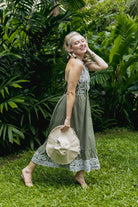 Chic halter-style summery dress featuring intricate computer embroidery on the upper half, perfect for a breezy, elegant daytime look.