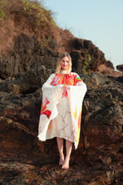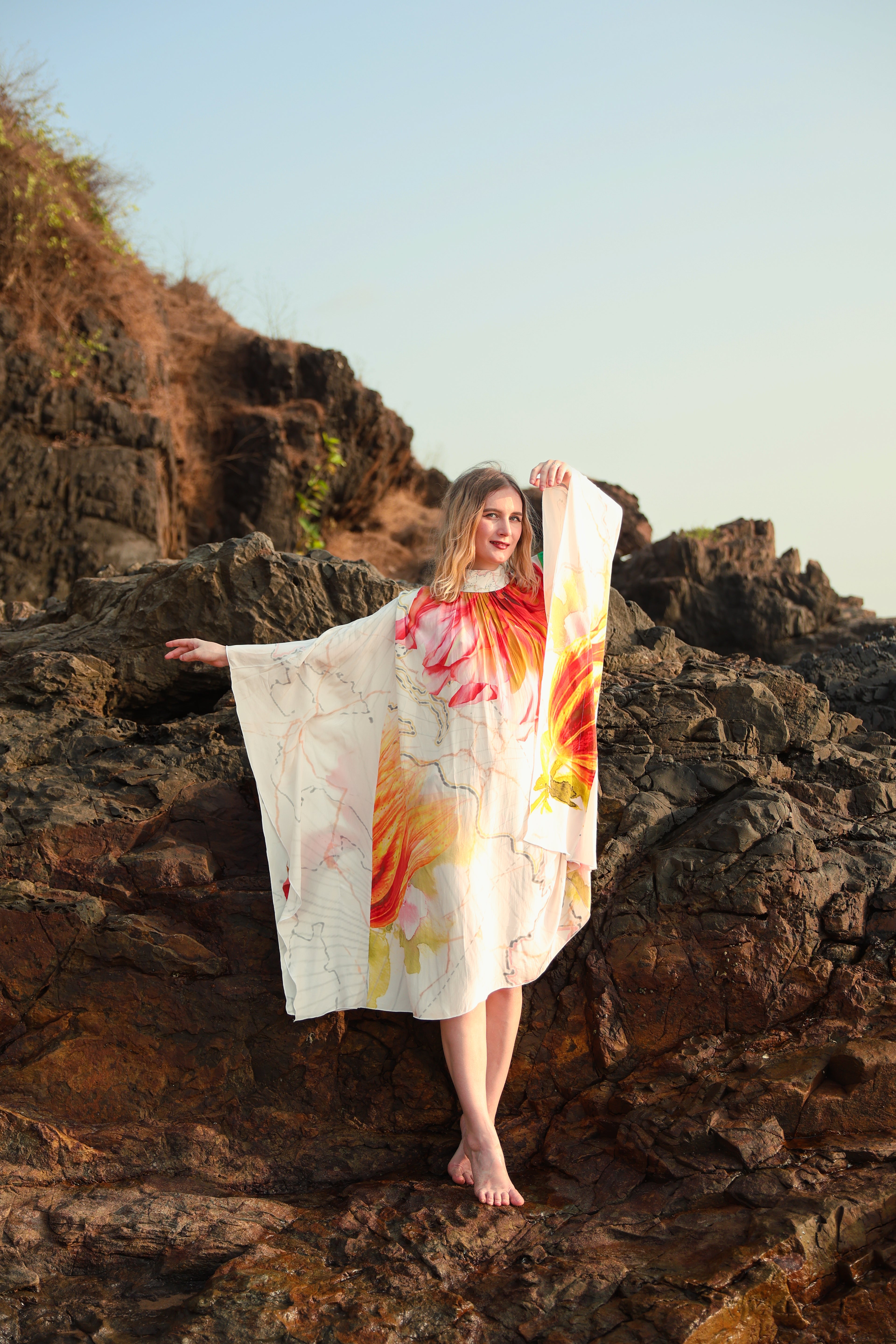 This orange and white short kaftan dress is a vibrant, easy‑to‑wear piece that combines bold color with relaxed sophistication, perfect for resort wear, sundowners, and also beachwear. The loose, short kaftan silhouette with wide sleeves creates soft draping and fluid movement, while the abstract orange floral artwork against a white base gives it a fresh, artistic look. Crafted from a smooth, lightweight fabric, it feels airy on the skin and slips on effortlessly, offering a comfortable free‑size fit that flatters different body shapes with minimal styling.