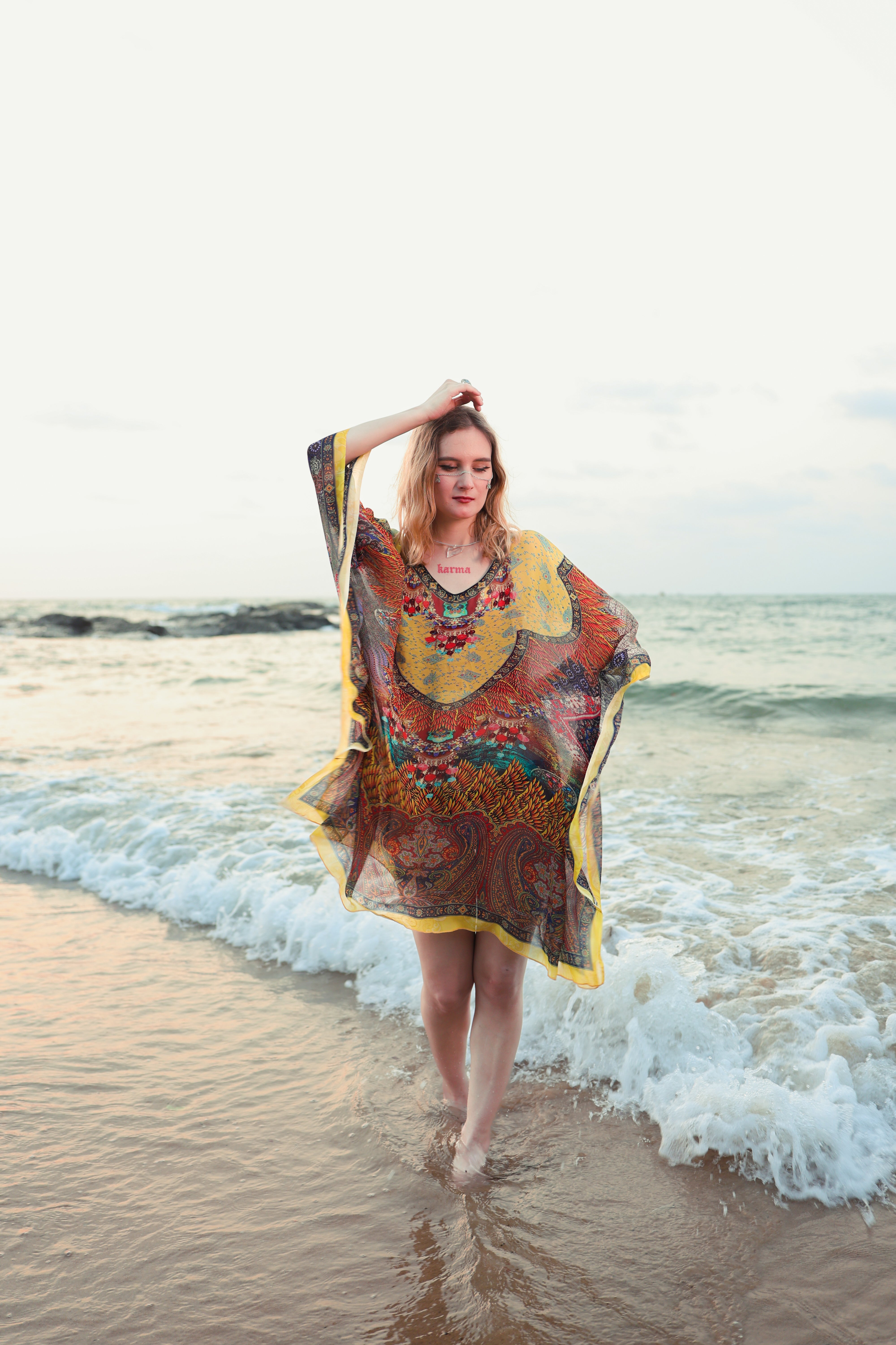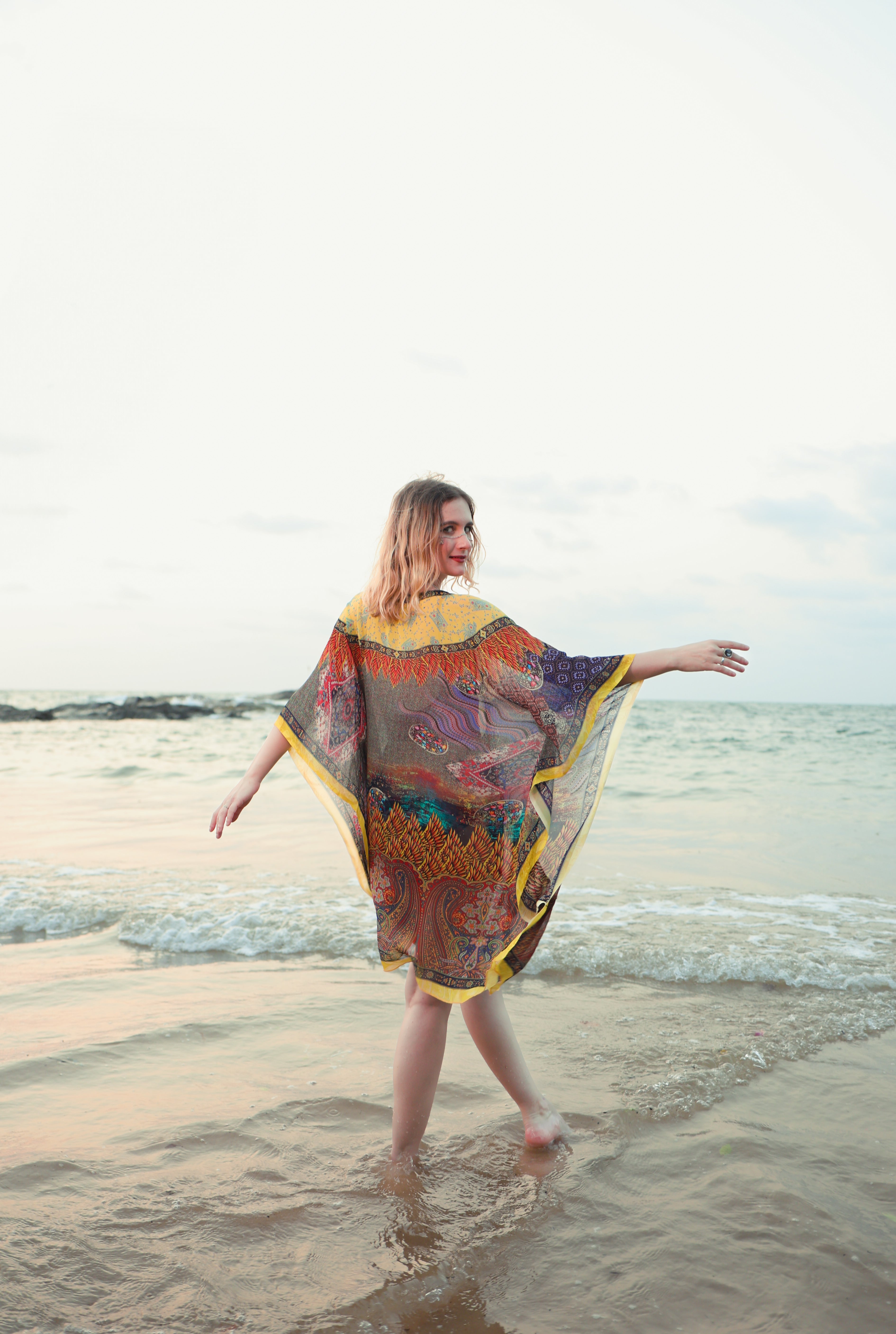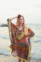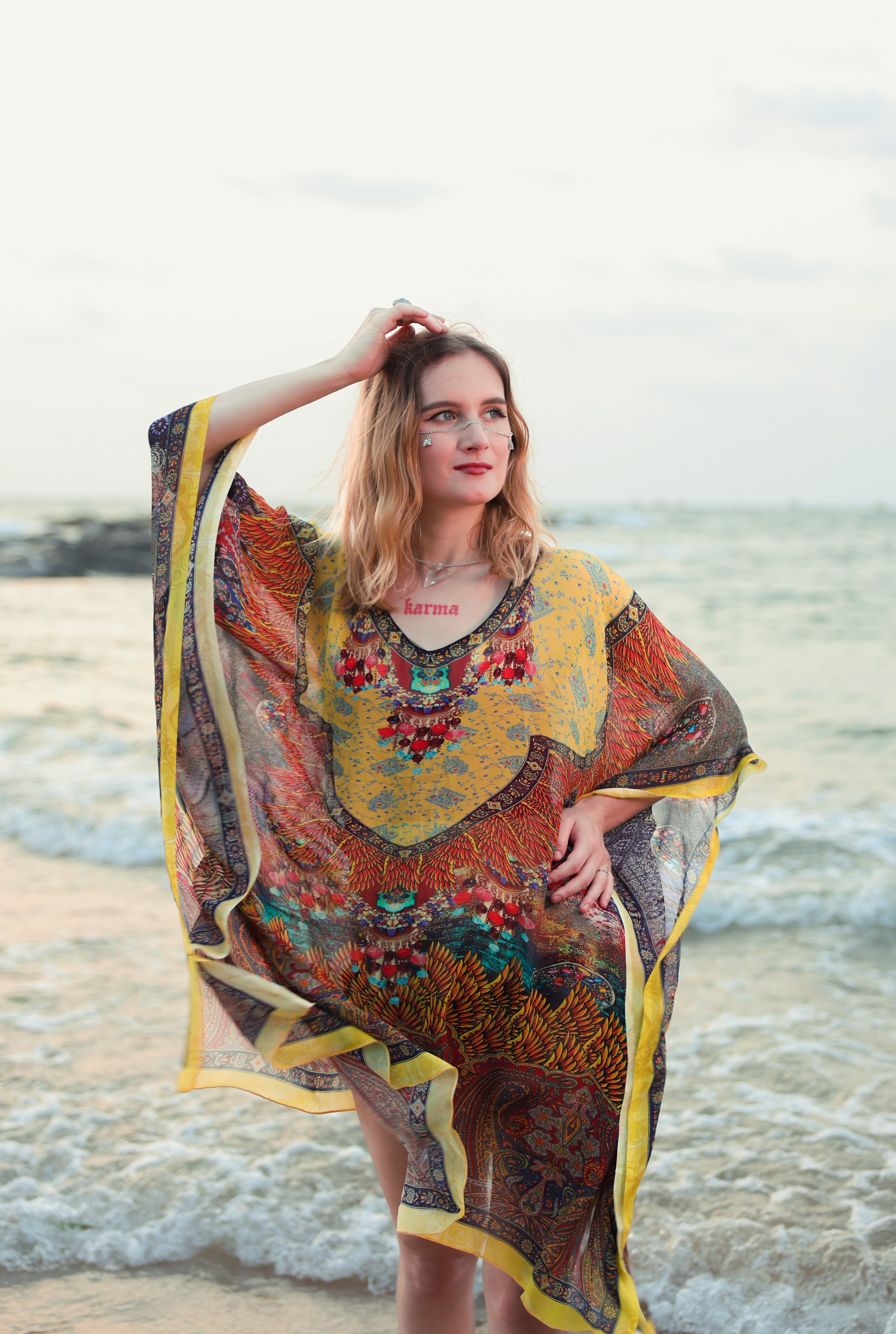 This short kaftan feels like a golden hour moment—warm, fluid, and quietly captivating. The mustard tone sets a rich, sunlit base, layered with intricate ornamental patterns that unfold as the fabric moves. Its airy, free-flowing shape creates a sense of ease, while the wide sleeves and soft borders add depth and character without overwhelming the silhouette. Designed for resort wear and also for beach wear, this piece speaks of understated luxury—meant to be worn, not styled.