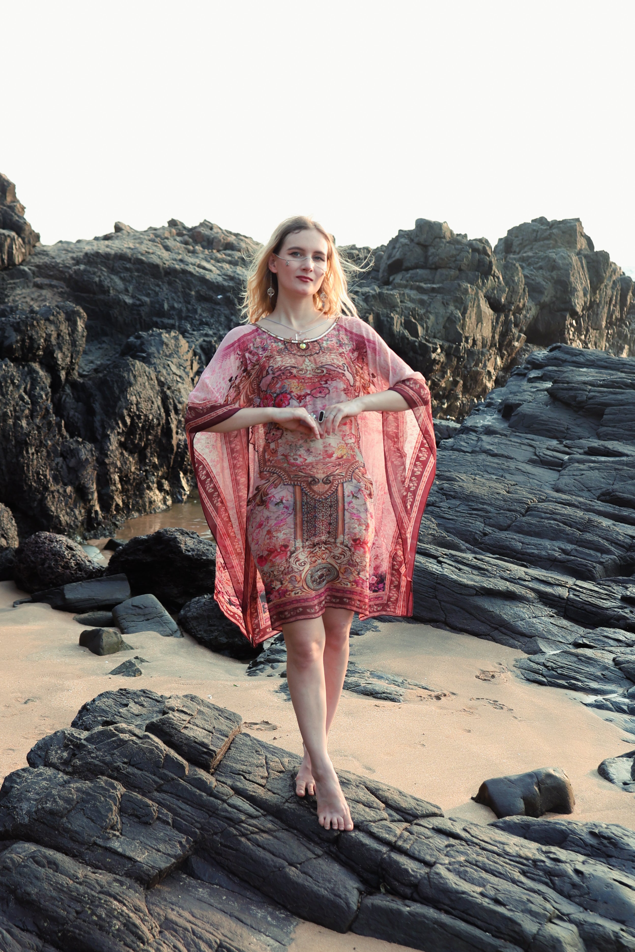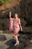 This pink short kaftan is crafted from premium viscose georgette fabric, offering a lightweight, airy, and smooth feel. The soft, flowy drape combined with elegant floral and ornamental prints creates a refined yet effortless look. Designed in a relaxed kaftan silhouette, it delivers all-day comfort while maintaining a polished appearance, making it perfect for beach wear as well as resort wear. The short length adds a modern touch, giving the outfit a chic and easygoing appeal.