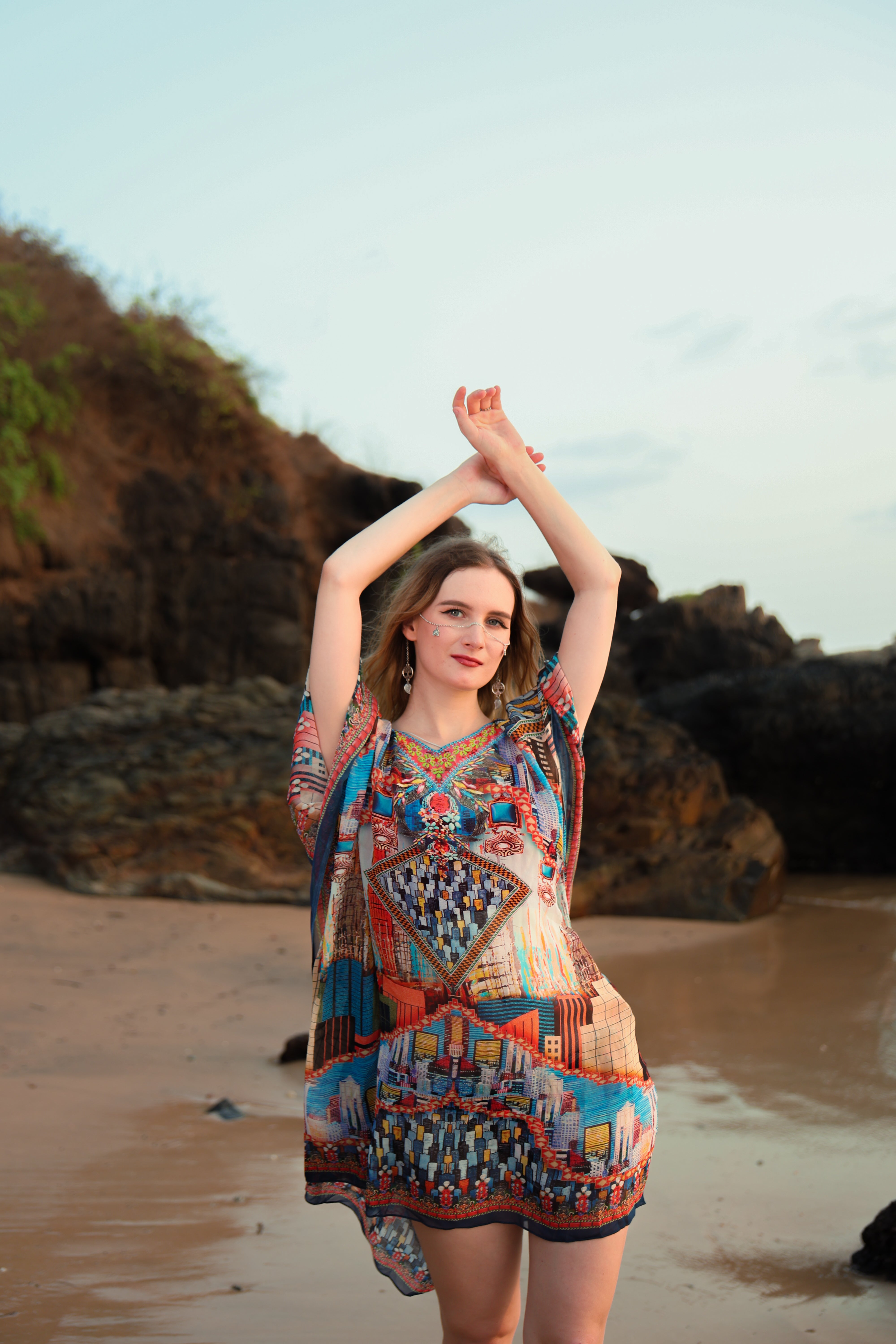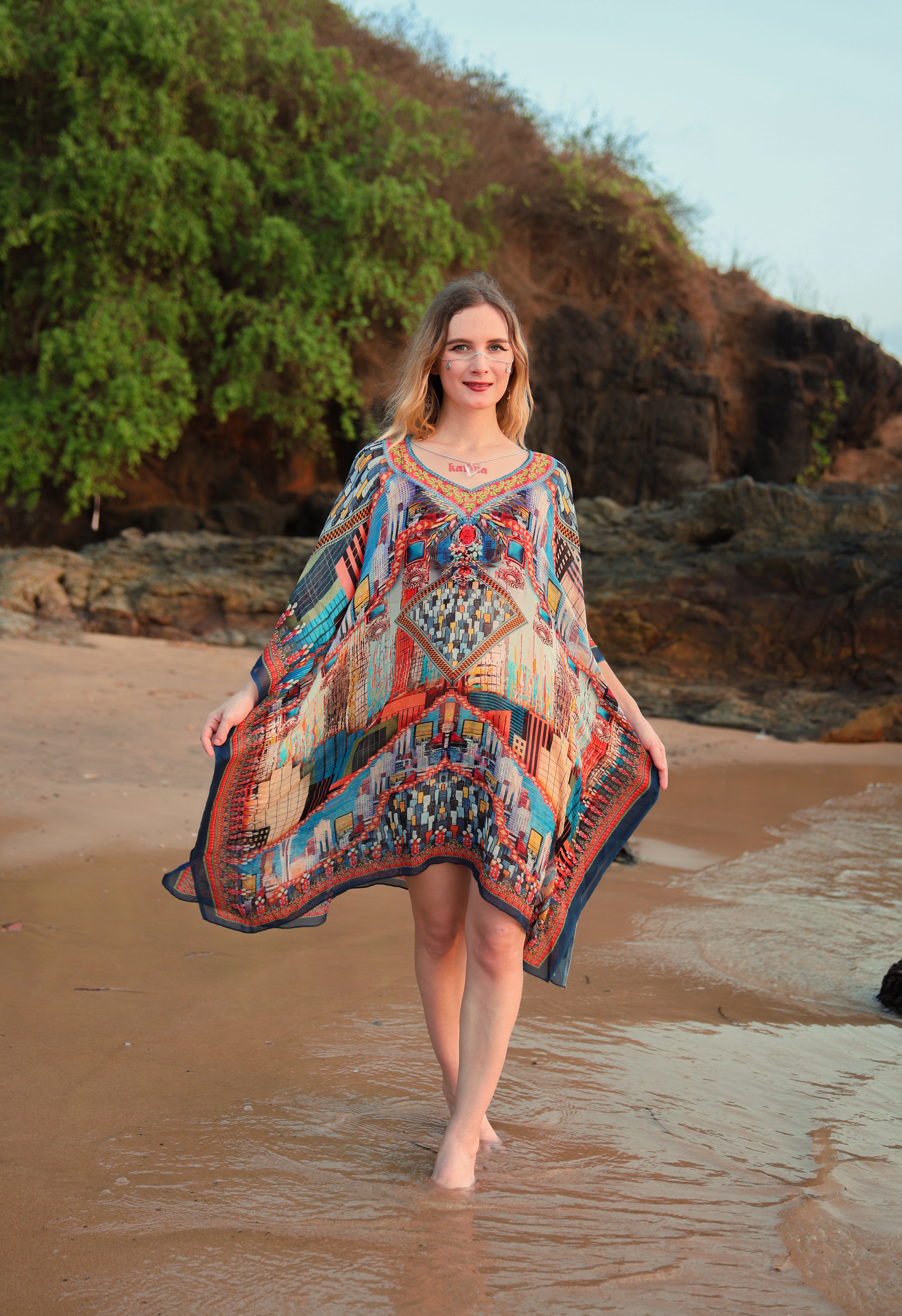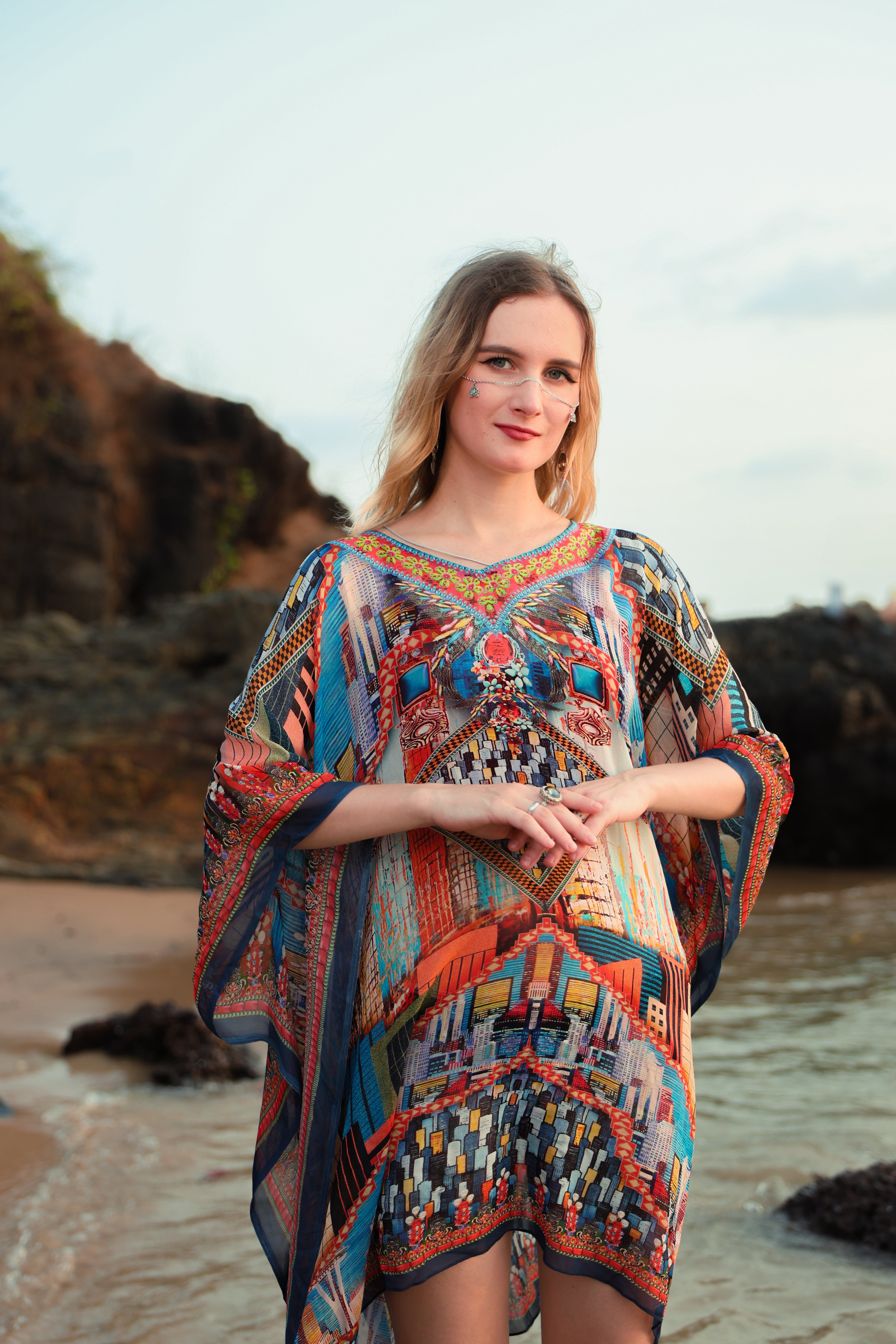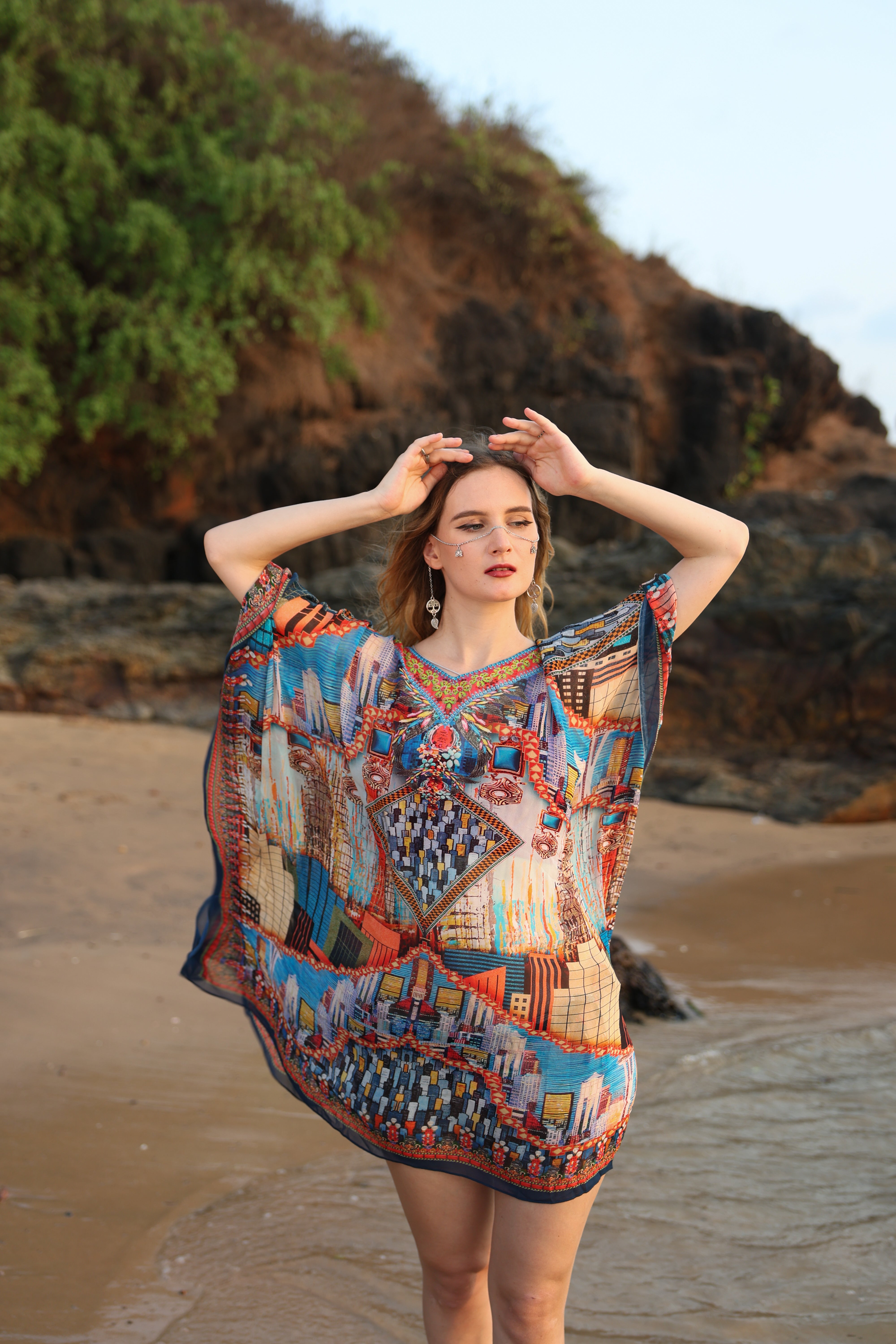 This short kaftan transforms contemporary visuals into wearable luxury. Crafted in a feather-light, fluid fabric, it features a striking cityscape–inspired collage print layered with geometric motifs and rich color contrasts. The structured placement artwork creates a bold focal point, while the relaxed silhouette keeps the look effortless and modern. Designed for the woman who appreciates art, travel, and individuality, this kaftan feels refined yet directional—perfect for elevated daywear that transitions seamlessly into evening escapes.